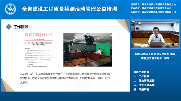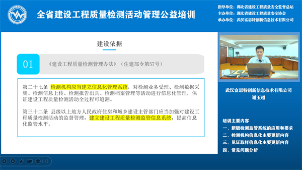 5月29日下午2:30,線上公益培訓(xùn)開始,武漢富思特創(chuàng)新信息技術(shù)有限公司總經(jīng)理謝玉超對(duì)新版湖北省建設(shè)工程質(zhì)量檢測監(jiān)管系統(tǒng)功能進(jìn)行詳細(xì)介紹,新版湖北省建設(shè)工程質(zhì)量檢測監(jiān)管系統(tǒng)運(yùn)用數(shù)字化手段和AI技術(shù),實(shí)現(xiàn)對(duì)檢測資質(zhì)和檢測活動(dòng)的動(dòng)態(tài)化、精準(zhǔn)化監(jiān)管,構(gòu)建了待辦中心、預(yù)警中心、決策中心三大核心功能模塊,實(shí)時(shí)監(jiān)測異常情況,并向監(jiān)管部門推送預(yù)警信息,助力各級(jí)監(jiān)管人員高效履職。系統(tǒng)還創(chuàng)新引入信用監(jiān)管機(jī)制,結(jié)合檢測機(jī)構(gòu)及從業(yè)人員的信用評(píng)價(jià),實(shí)施差異化監(jiān)管,推動(dòng)行業(yè)自律。 省質(zhì)安總站質(zhì)監(jiān)科工程師雷鳴對(duì)湖北省建設(shè)工程質(zhì)量檢測行業(yè)管理工作進(jìn)行了回顧,介紹了以后一段時(shí)期要開展的主要工作及工作思路,比如:落實(shí)分類監(jiān)管、對(duì)墻體保溫材料整治與住建部住宅工程常見問題重點(diǎn)整治、修訂地標(biāo)《房屋市政工程質(zhì)量檢測項(xiàng)目分類規(guī)范》,通過提高市場行為、技術(shù)行為從而提高行業(yè)管理標(biāo)準(zhǔn)化水平、探索數(shù)智賦能和開展行業(yè)調(diào)研等工作,最后,對(duì)前期征集的大家關(guān)注的特別是新舊資質(zhì)過渡期間存在的相關(guān)問題進(jìn)行答疑,并呼吁檢測機(jī)構(gòu)堅(jiān)持初心,切實(shí)履行好為工程質(zhì)量保駕護(hù)航的使命。 這次培訓(xùn)對(duì)于全省監(jiān)督機(jī)構(gòu)、檢測機(jī)構(gòu)平穩(wěn)完成新舊資質(zhì)過渡、規(guī)范檢測行為、在新資質(zhì)標(biāo)準(zhǔn)下推動(dòng)行業(yè)發(fā)展具有很強(qiáng)的指導(dǎo)作用。全省建設(shè)工程質(zhì)量監(jiān)督人員、檢測機(jī)構(gòu)相關(guān)人員計(jì) 7600人參加了本次培訓(xùn)。 此次培訓(xùn)由武漢富思特創(chuàng)新信息技術(shù)有限公司承辦。